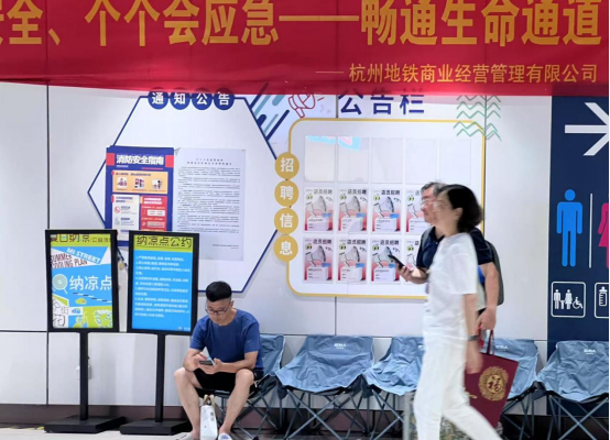 高温期间(下午2点起),纳凉点内提供免费瓶装饮用水,供大家按需取用,及时补充水分、缓解暑热。此外,我们还准备了印有专属标识的定制凉扇,免费发放给乘客和户外工作者。大家在歇息或转乘时使用这把小扇子,也能感受到杭州地铁商管人的一份心意。