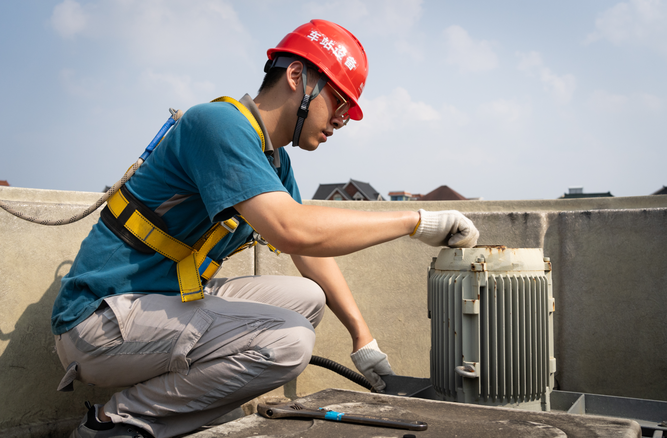 炎炎夏日,空调机组的良好运行至关重要。钟东辉是一名通风空调工班的维修工,他和同事需要在环境温度高达40多度的蒸发冷机房里调试蒸发冷压缩机跑油,一待就是2、3个小时。不仅如此,车站地面的冷却塔在烈日暴晒之下,表面温度甚至攀升至50℃以上,钟东辉需要穿戴安全帽和安全带,爬到冷却塔顶部检查确认扇叶和皮带轮工作状态是否良好,查看冷却水水位以及进水口、积水盘是否有杂物。